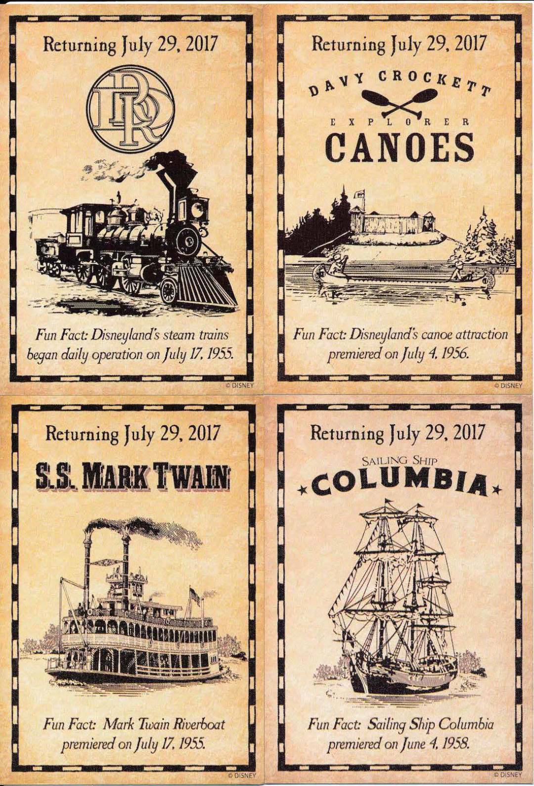 Four classic attractions are officially returning Saturday, July 29... the Disneyland Railroad, Explorer Canoes, the Mark Twain Riverboat, and the Sailing Ship Columbia! These fan favorites have been on a long hiatus (since January 2016), during the reconfiguration of the railroad tracks and the river, in order to pave way for the upcoming Star Wars … Continue reading Four classic Disneyland attractions return July 29, after a long hiatus